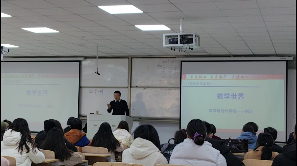 11月24日上午,世界杯体育官方网站近三年新进教师在学院第三届教学督导团秘书长葛寒松的带领下,在行方楼117教室进行了一场别开生面的课堂教学观摩学习活动,本次活动主讲教师为数学与统计学院荆天副教授,授课对象为音乐学院音乐学专业学生,主讲内容为《教师科学素养》课程中的《数学世界》,世界杯体育校级教学督导员参加了本次课堂教学观摩活动。
