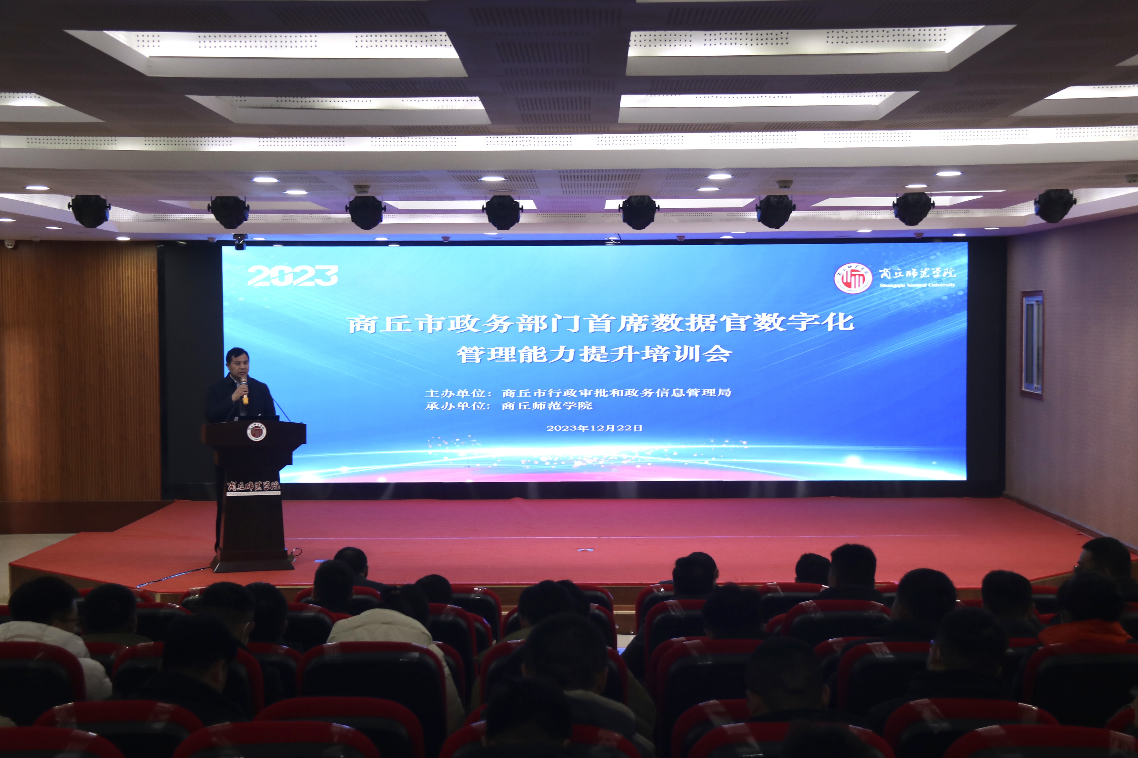 12月22日,由商丘市行政审批和政务信息管理局主办、信息技术学院承办的2023年商丘市政务部门首席数据官数字化管理能力提升专题培训会在世界杯体育三商楼145会议室成功举办。商丘市行政审批和政务信息管理局副局长李红星主持并做了动员讲话,副校长翟滨教授致欢迎词。