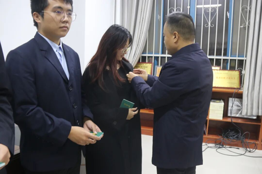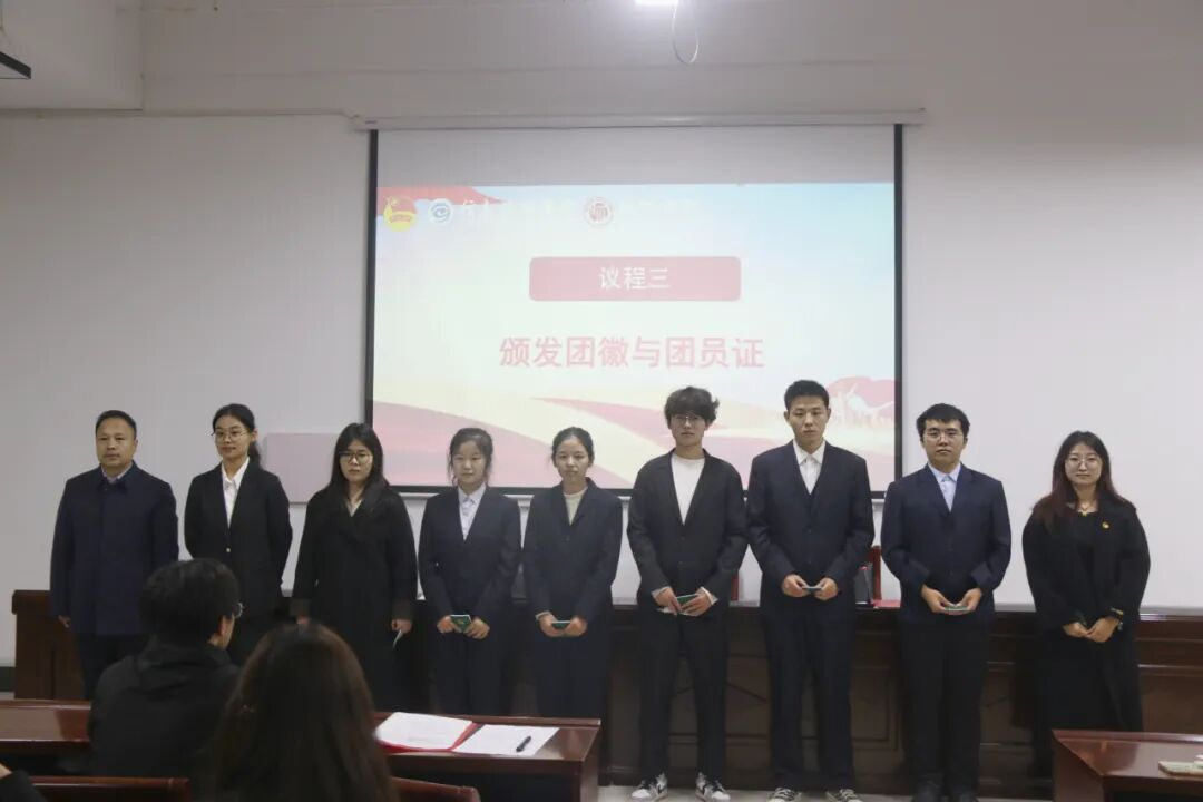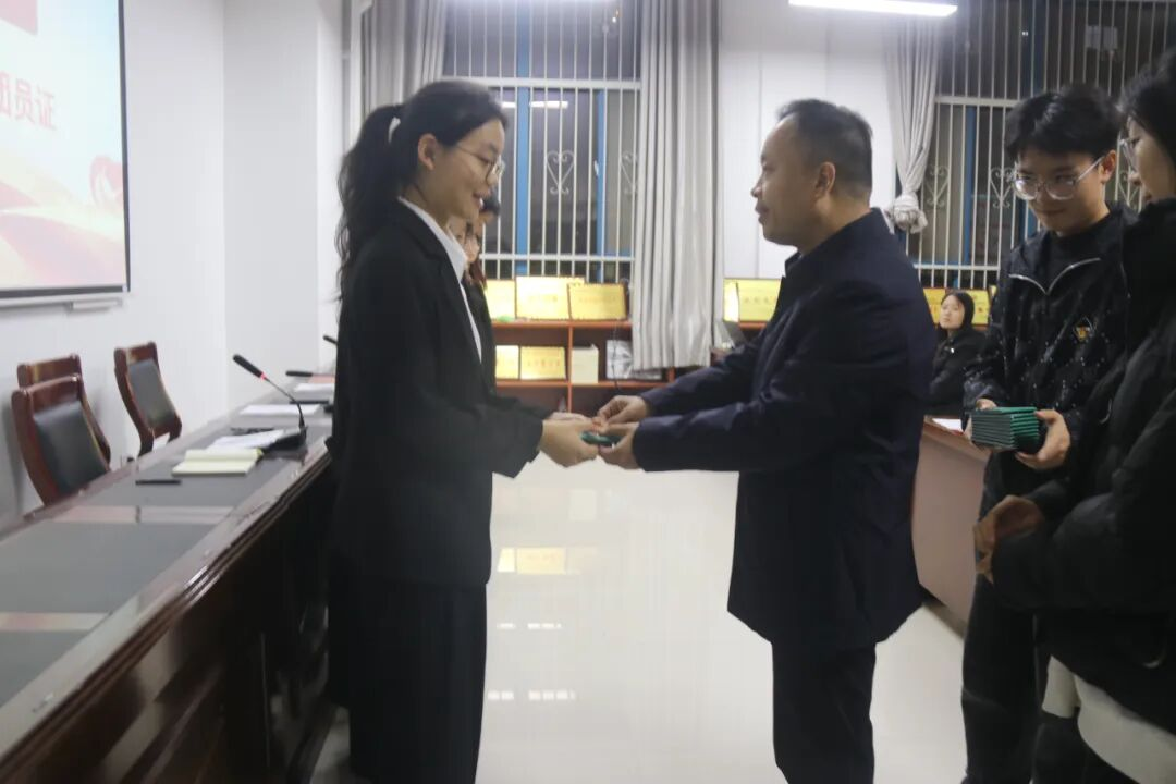 仪式在雄壮的国歌声中拉开序幕。李媛宣读了2025年新发展团员名单,晁祯等79名青年学生光荣加入中国共产主义青年团。王国华书记为新团员颁发团员证、佩戴团徽,金色的团徽在胸前闪耀,象征着责任与使命的传递。