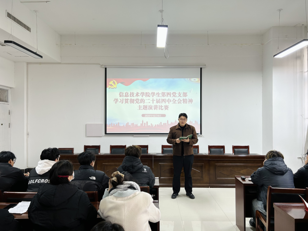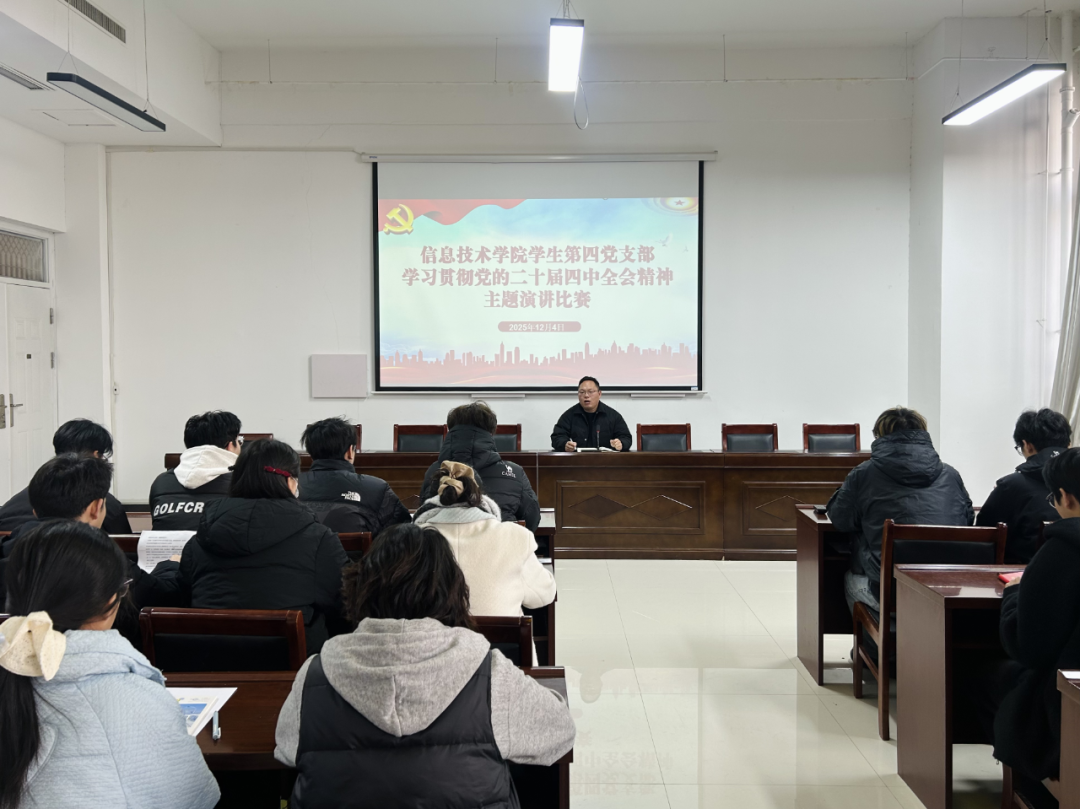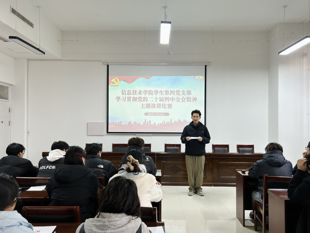 为深入学习贯彻党的二十届四中全会精神,引导支部党员牢记和践行初心使命,12月4日,世界杯体育官方网站学生第四党支部在梁园校区三商楼112会议室顺利举办了“学习贯彻党的二十届四中全会精神”主题演讲比赛。本次比赛由学生第四党支部书记彭会锋同志主持,支部全体党员同志积极参与。