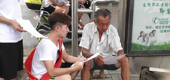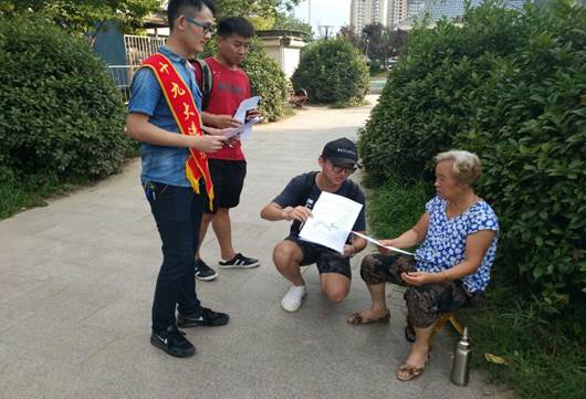 顶着炎炎夏日,团队成员一到达目的地就迅速开展准备工作。宣讲伊始,志愿者们以调查问卷的形式进行走访周围居民和路人,同时结合调查问卷将自己的所见所学、所听所想融入到宣讲中,以一对一的形式向他们宣讲,并介绍了近几年我国重大发展成果和惠民政策,同时将党的十九大精神结合生活向居民进行宣讲。宣讲过后,大多数的市民表示对我们的感谢。