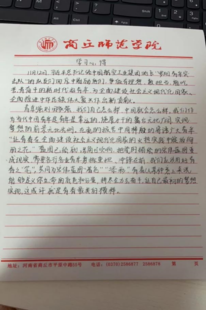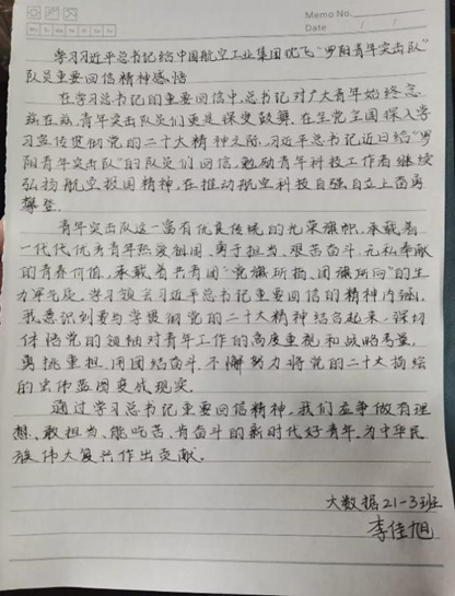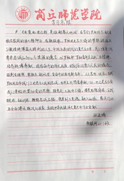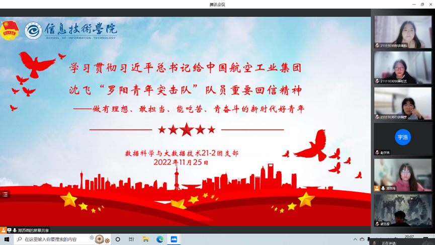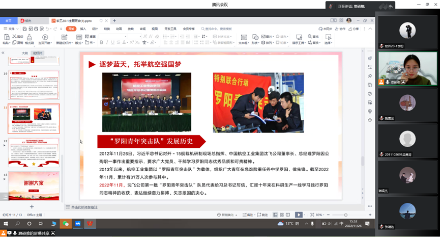 最后,各班同学以团支部为单位积极分享学习感悟,各支部青年团员纷纷表示,在以后的学习、工作和生活当中,将“罗阳精神”内化于心、外化于行。珍惜来之不易的和平环境,把爱国主义热情贯彻在实际行动中,转化为做好本职工作、努力学习的动力,增强报效祖国的本领,坚持与祖国共奋共进,书写青春动人故事。以实际行动践行“请党放心,强国有我”的青春誓言。