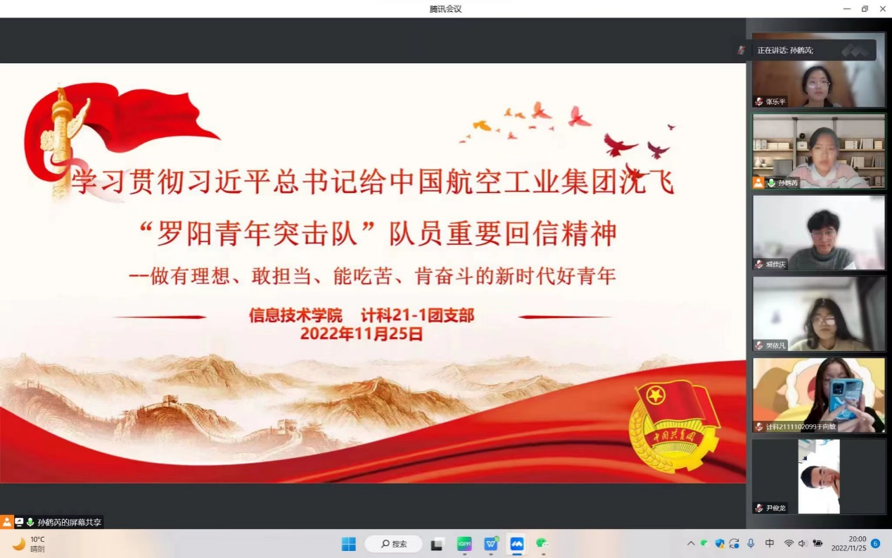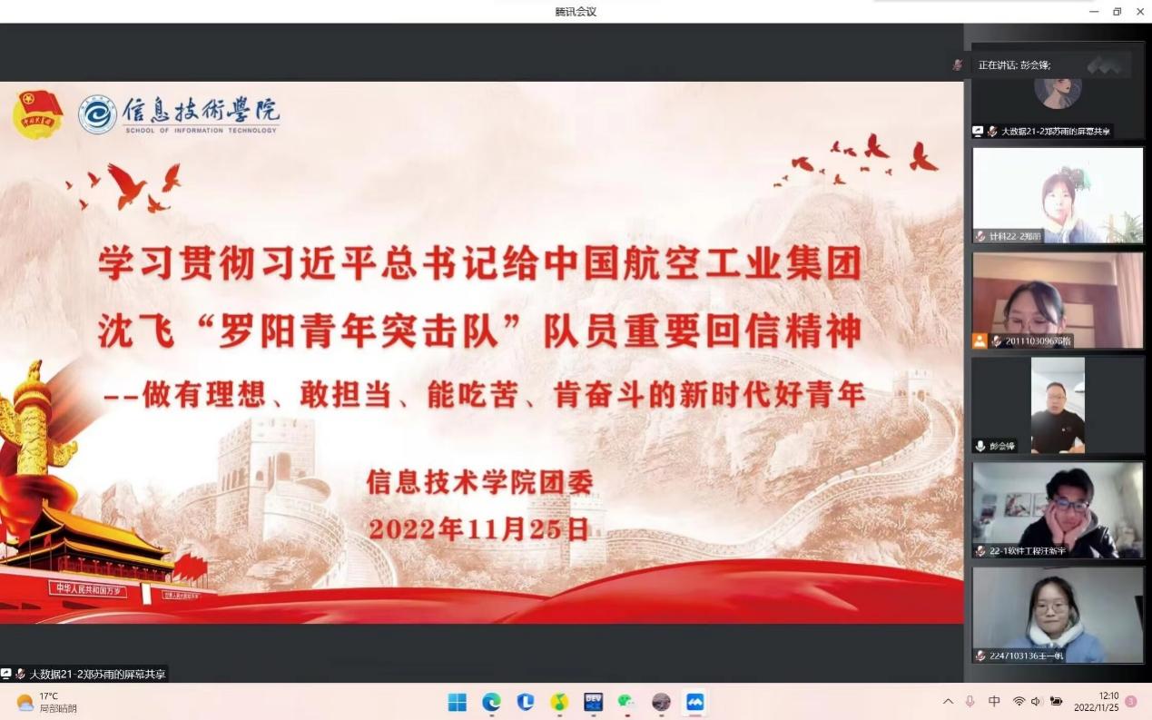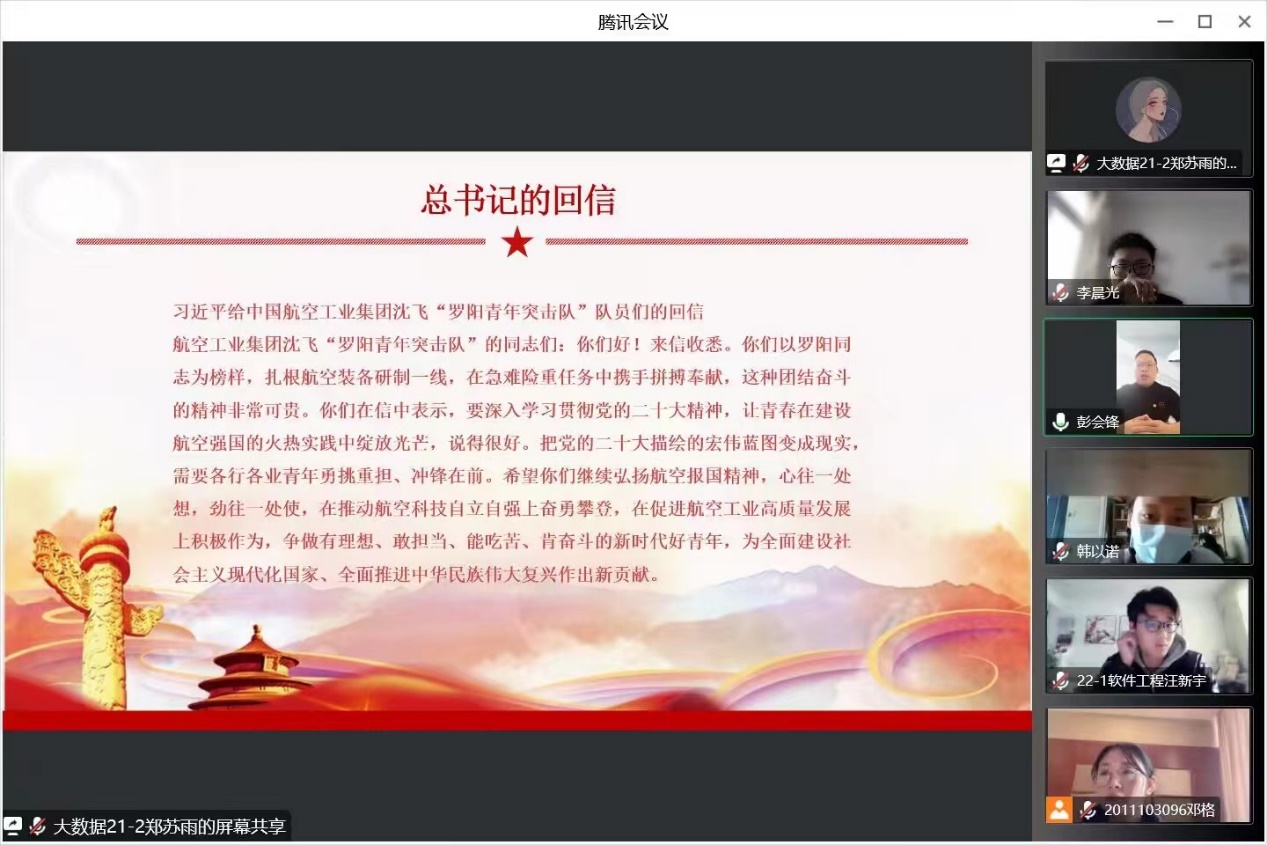 在学院团委负责人彭会锋老师的带领下,全院各团支部书记、团学干部认真地学习了习近平总书记给中国航空工业集团沈飞“罗阳青年突击队”重要回信精神,并结合自己的专业学习和生活、工作等方面进行了讨论交流。彭会锋要求大家要全面、系统、准确地学习贯彻习近平总书记重要回信精神,以回信精神为指引,摒弃“骄娇”二气,勇于担当,坚定信念,展现奋发有为的新时代青年大学生的风采。