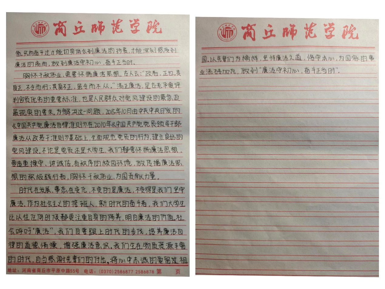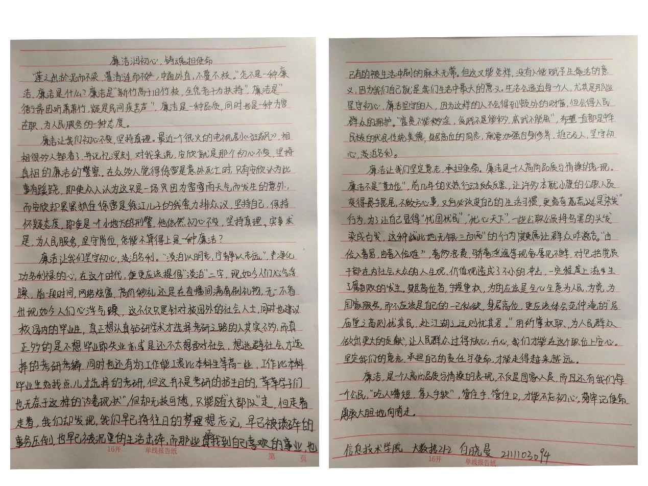 学院学生通过手中的笔墨描绘出内心的纯洁净土,刻画出中国自古以来清廉文化的印记,为自己和身边的同学埋下廉洁的种子。鼓励同学们清清白白做事,堂堂正正做人。