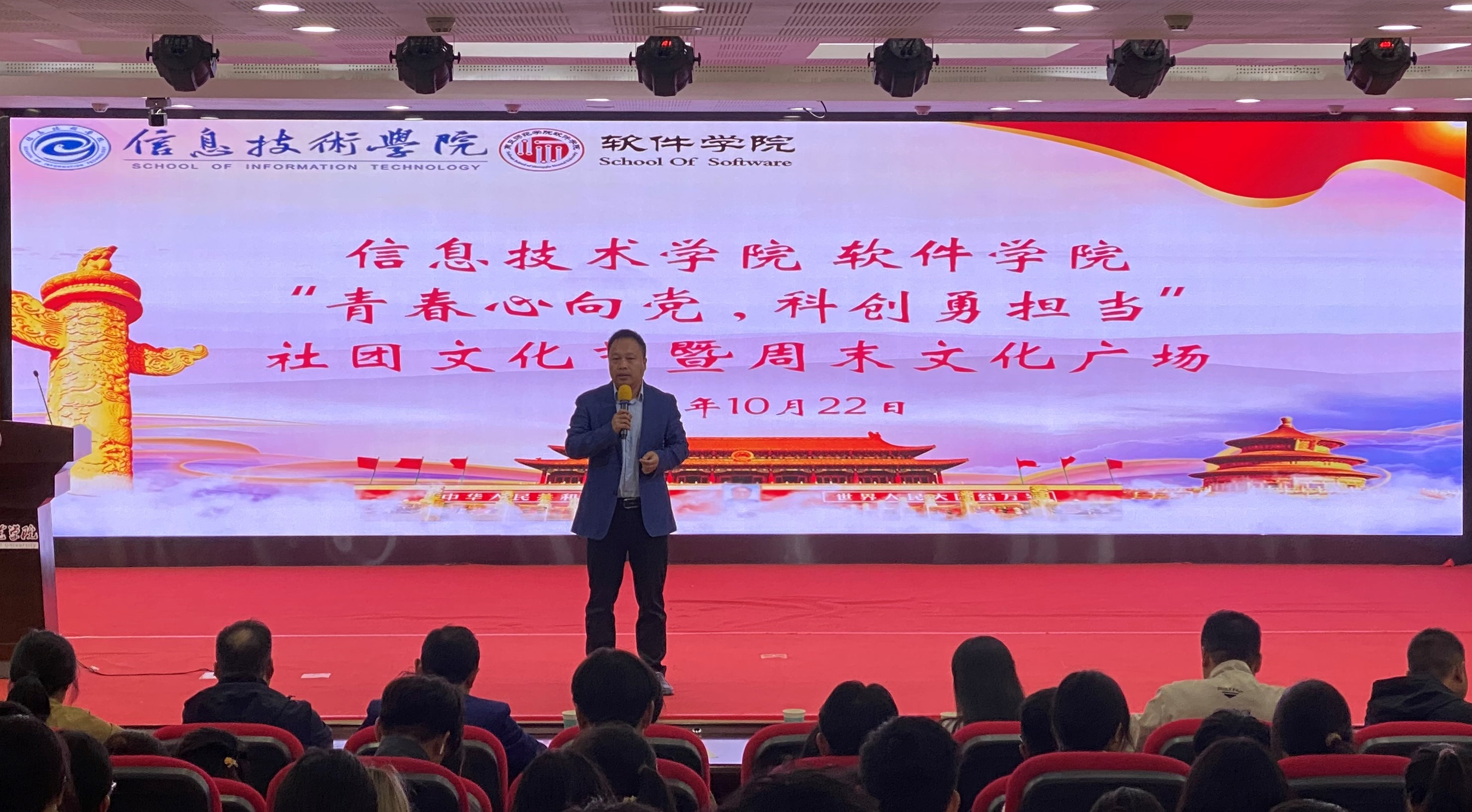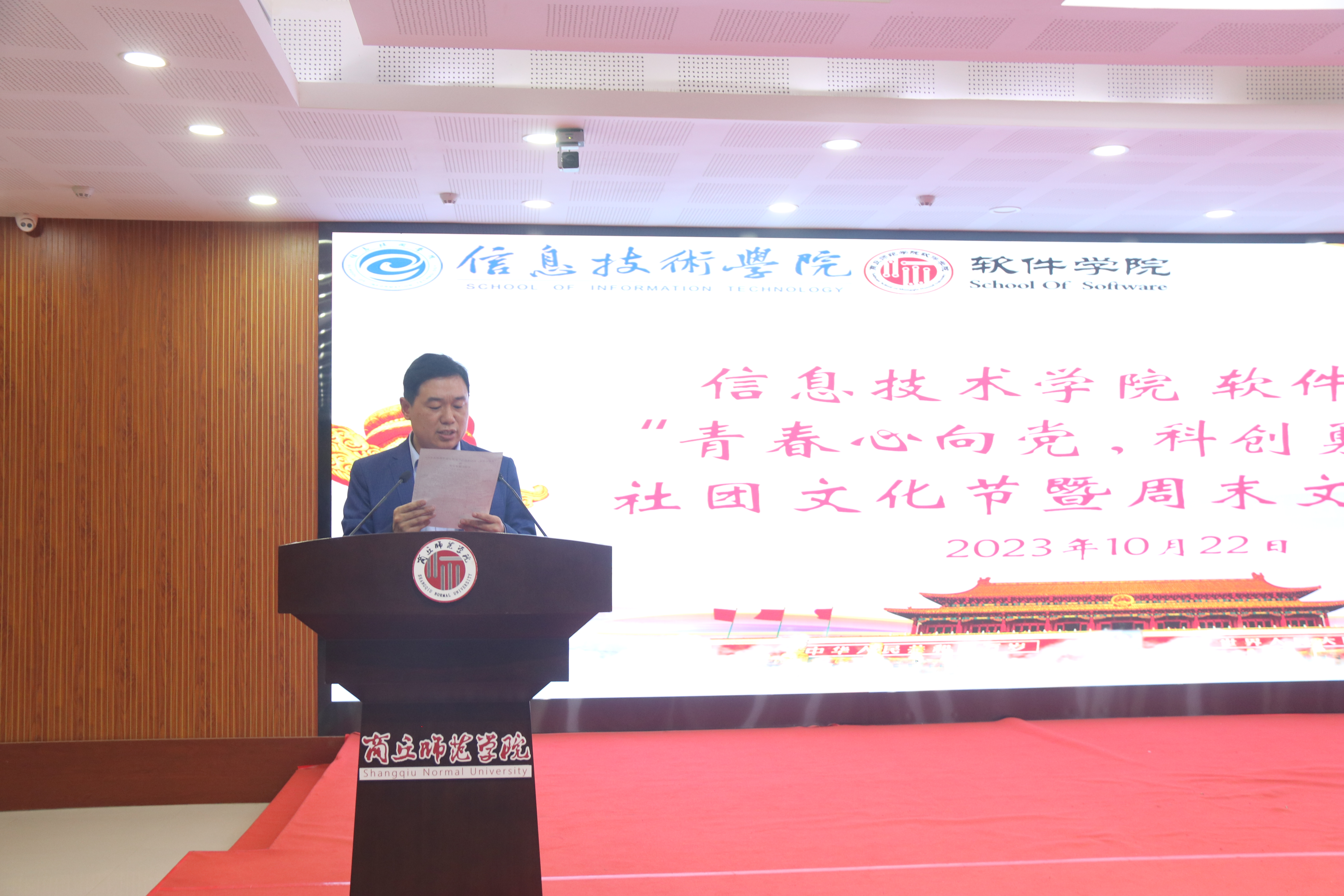 为进一步涵育优良学风,营造积极向上的学习氛围。10月22日晚,世界杯体育官方网站在梁园校区三商楼举办了以“青春心向党,科创勇担当”为主题的社团文化节暨周末文化广场活动。世界杯体育官方网站党委书记王国华、院长王春霞、副书记袁慧、副院长刘佳、各社团指导老师和两百余名学生代表参加了活动。本次社团文化节共分为两个环节,分别在145主会场和八个分会场进行。