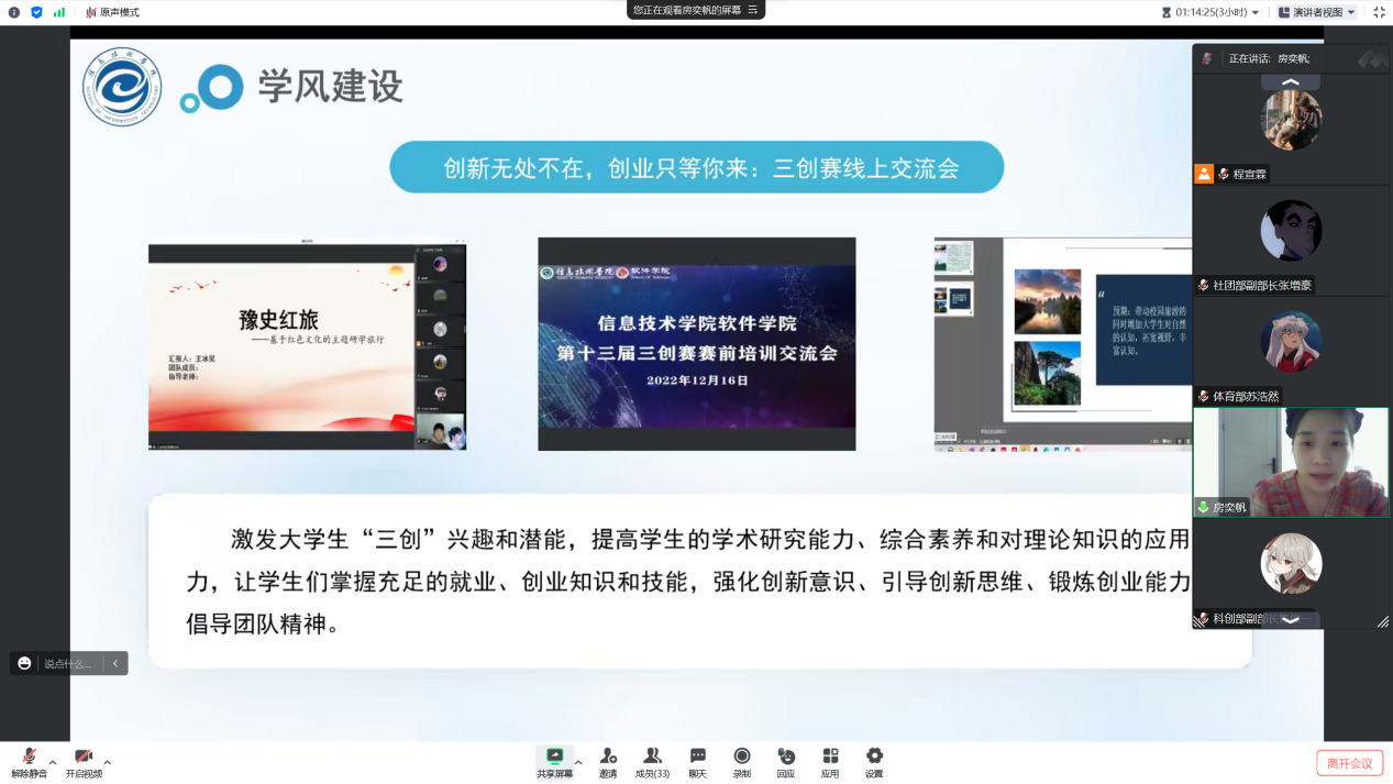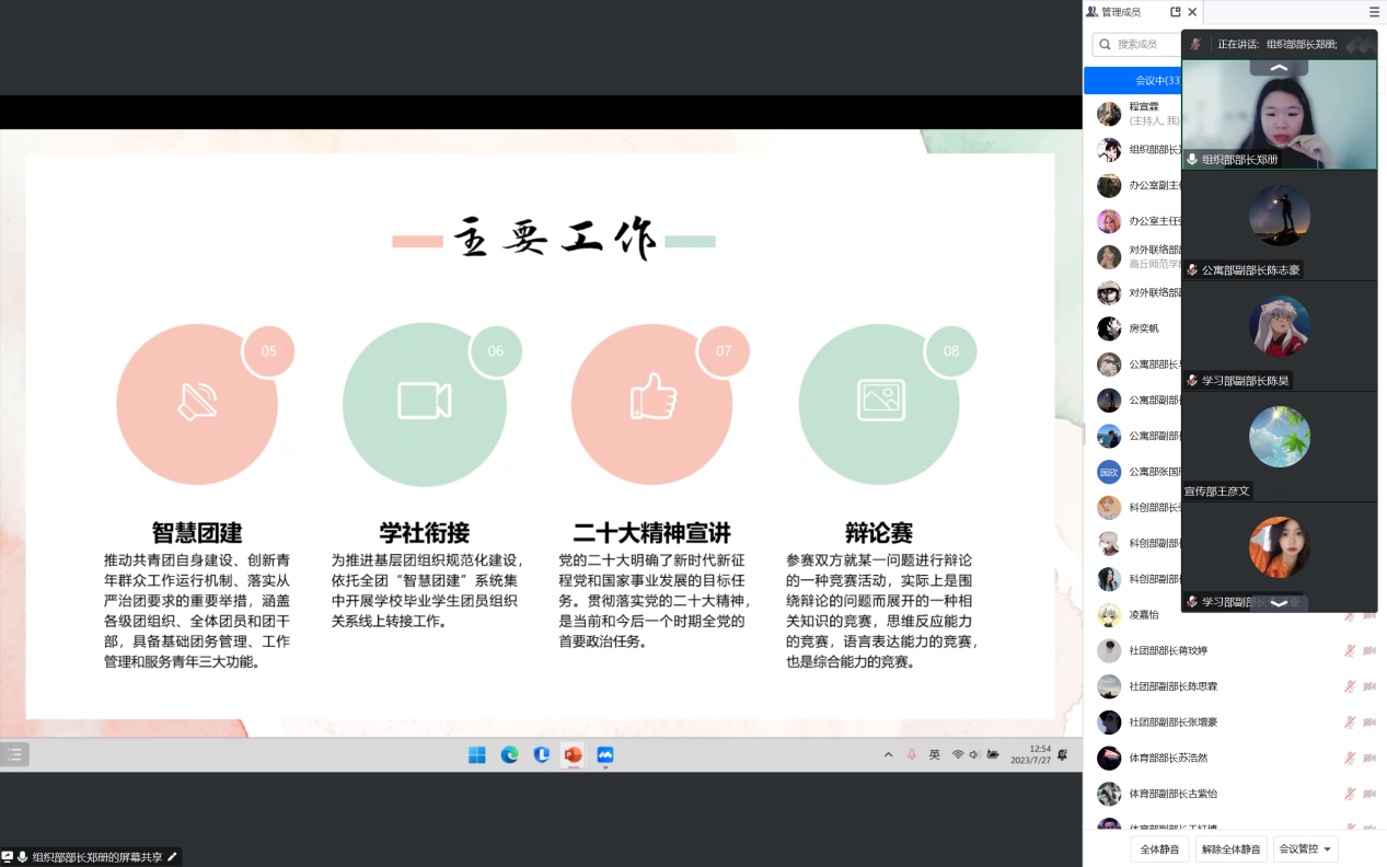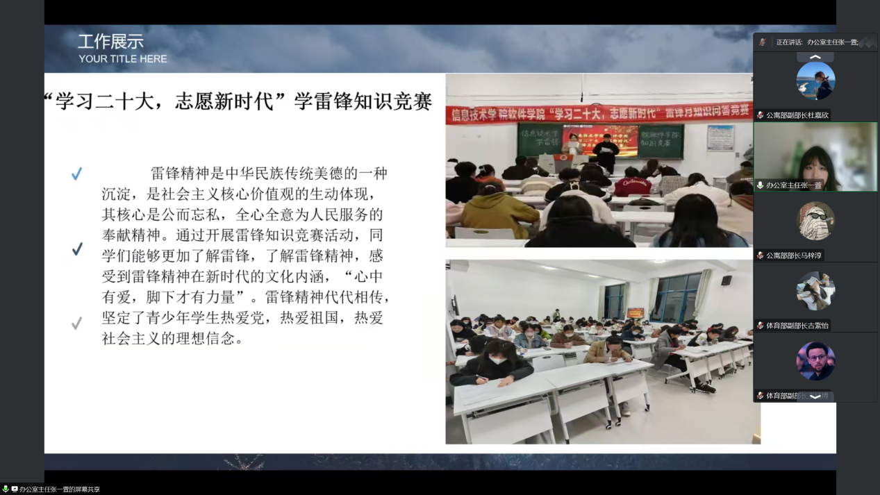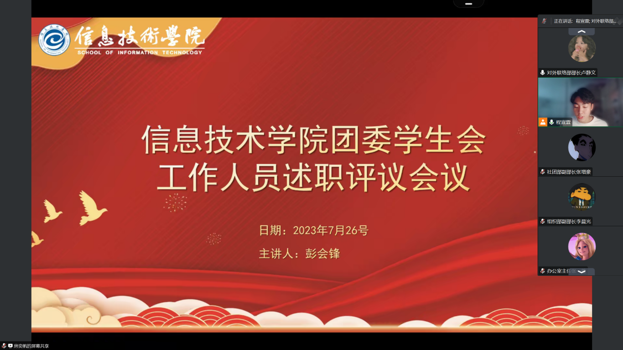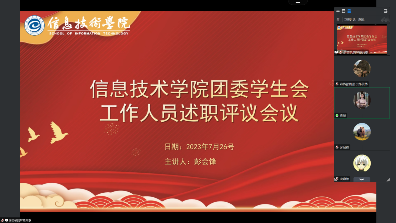 为深入贯彻贯彻落实习近平总书记关于青年工作重要论述,进一步加强团学骨干能力培养,推动学生会管理工作的科学化、规范化,世界杯体育官方网站团委学生会于2023年7月26日举行2022-2023学年部门述职评议会。参与本次会议的有世界杯体育官方网站党委副书记袁慧,信息技术学院团委书记彭会锋,学生会全体成员和学生代表,本次会议由彭会锋老师主持。