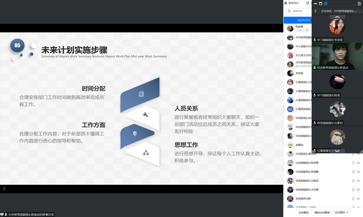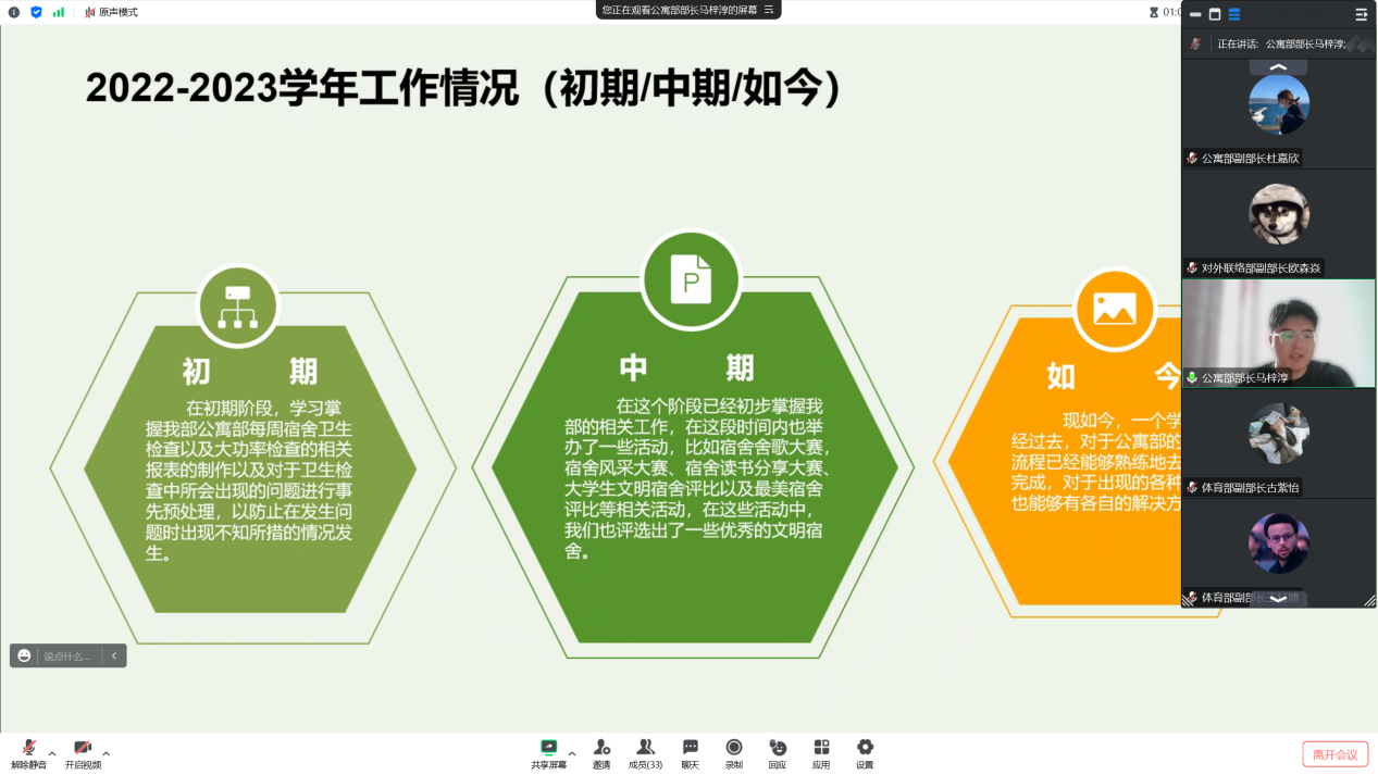 随后,世界杯体育官方网站团委学生会执行主席程宣霖宣读二级学院述职评议相关工作通知以及评议要求。接着,各部门部长代表及主席团代表依次述职,分别从部门职责、工作成果、工作不足与改进措施以及未来展望等方面就各自负责的工作领域进行详细汇报。他们分享了自己在过去一年中所取得的进展和成果,同时对遇到的困难和挑战进行了分析,并展示了相应的解决方案和改进措施。