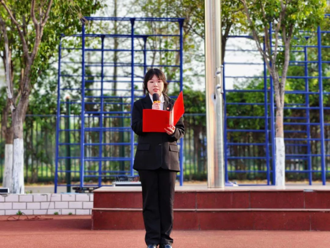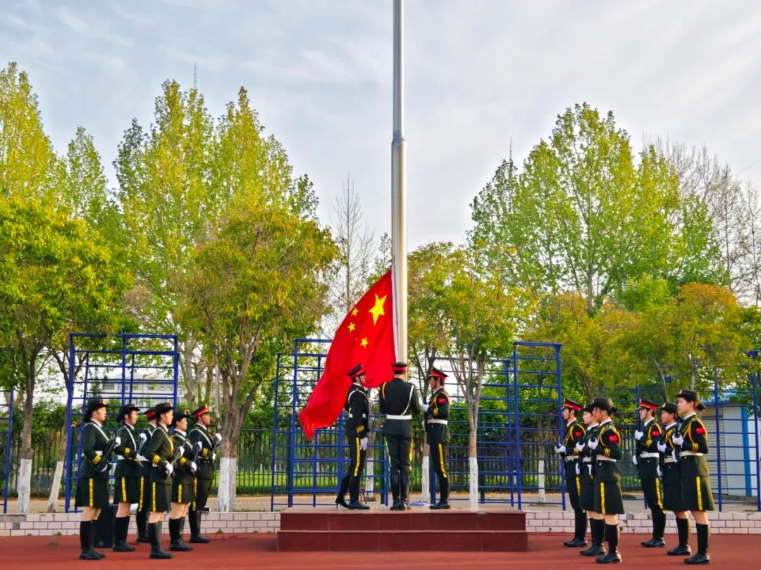 国旗护卫队迈着整齐的步伐,护送鲜艳的五星红旗至升旗台。在嘹亮的国歌声中,国旗冉冉升起,全体师生面向红旗行注目礼,共唱国歌。