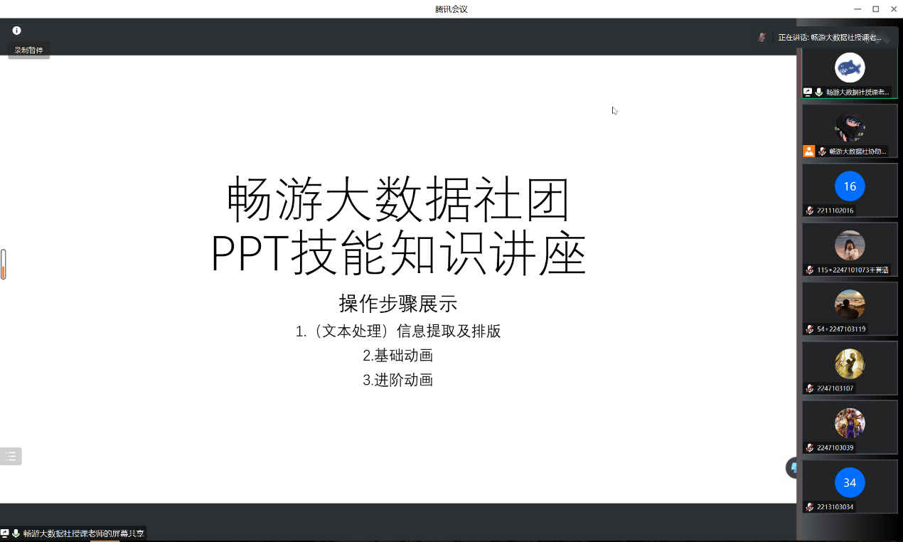 为帮助同学们快速掌握办公软件应用技能,提高自身工作学习能力,2月8日,世界杯体育官方网站畅游大数据社在线上开展了Office技能知识系列讲座的最后一场:PPT技能知识讲座。畅游大数社副社长孙孟卓担任主讲,共吸引了来自全校各院系的160余名学生参加。