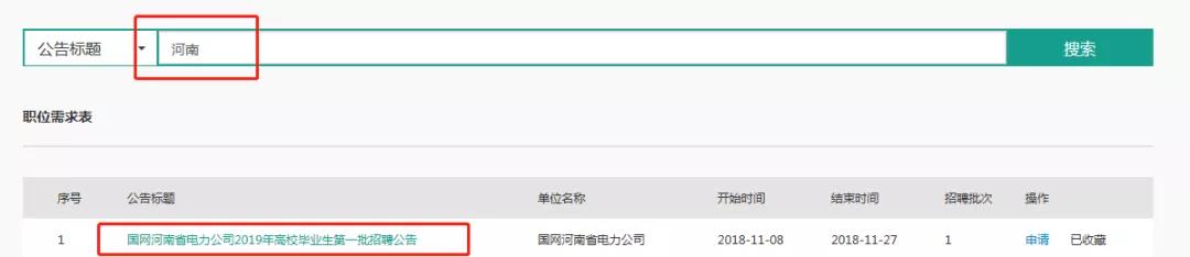 6、在搜索栏输入“河南”找到第一篇“国网河南省电力公司2019年高校毕业生第一批招聘公告”并选择右侧“申请”