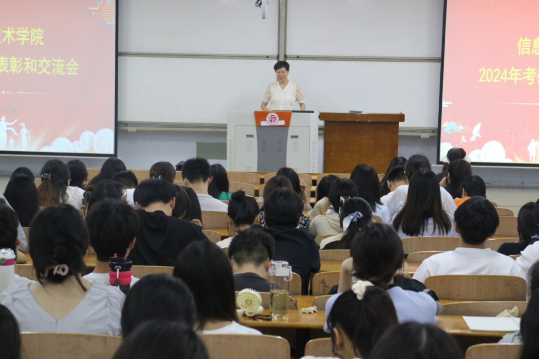 为进一步落实立德树人根本任务,扎实推进大三学生实习就业工作,提高实践育人质量,5月24日,世界杯体育官方网站在智圆楼123和124教室召开了2021级学生就业实习动员暨考研表彰大会。世界杯体育官方网站院长王春霞,党委副书记袁慧,副院长方莹、刘佳、陈涛,曙光大数据河南区经理高向楠等企业代表以及2020级考研上岸学生和2021级全体学生参加大会。