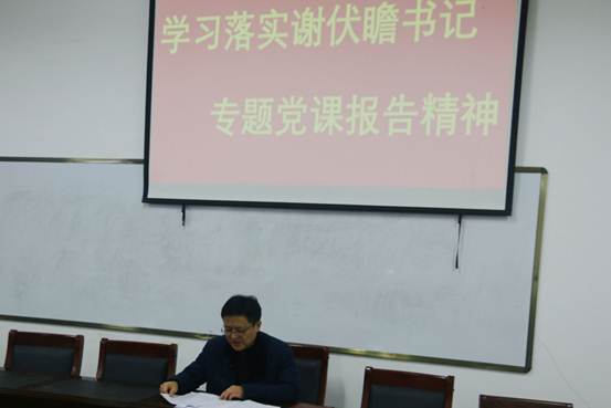 1、12月29日下午,张辉书记在中德楼106会议室带领全体教职工集中学习贯彻谢伏瞻书记宣讲党的十九大专题党课报告精神。会上,大家集中学习了谢伏瞻书记在河南师范大学做的题为《站位新时代 践行新思想 书写新华章 争做有理想有本领有担当的新时代青年》的专题党课报告。然后围绕谢伏瞻书记的报告精神,对广大青年教师提出了要求,就是在学习党的十九大精神、习近平总书记系列讲话精神、习近平谈治国理政新策略的基础上,深刻理解谢伏瞻同志对新时代青年的嘱托和希望,结合自己的工作实际,在教书育人、为人师表上率先垂范,为把青年一代培养成为有理想、有信念、有道德、有作为的社会主义建设者贡献力量。