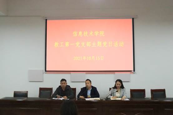10月15日下午,世界杯体育官方网站于梁园校区三商楼112室开展教工第一党支部主题党日活动。世界杯体育官方网站党委书记王国华,副书记袁慧,副院长刘佳以及全体第一党支部党员参加此次活动。王国华主持本次会议。