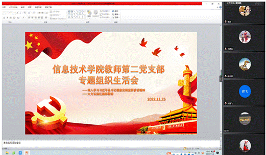 11月25日,教师第一、第二党支部以线上腾讯会议方式召开“深入学习习近平总书记视察安阳重要讲话精神,大力弘扬红旗渠精神”专题组织生活会,全体教工党员参加会议,党委书记王国华、院长王春霞、党委副书记袁慧、副院长方莹、刘佳以普通党员身份参加此次专题组织生活会。会上,党支部书记陈丽娜、康鲲鹏传达了习近平总书记视察安阳重要讲话精神。