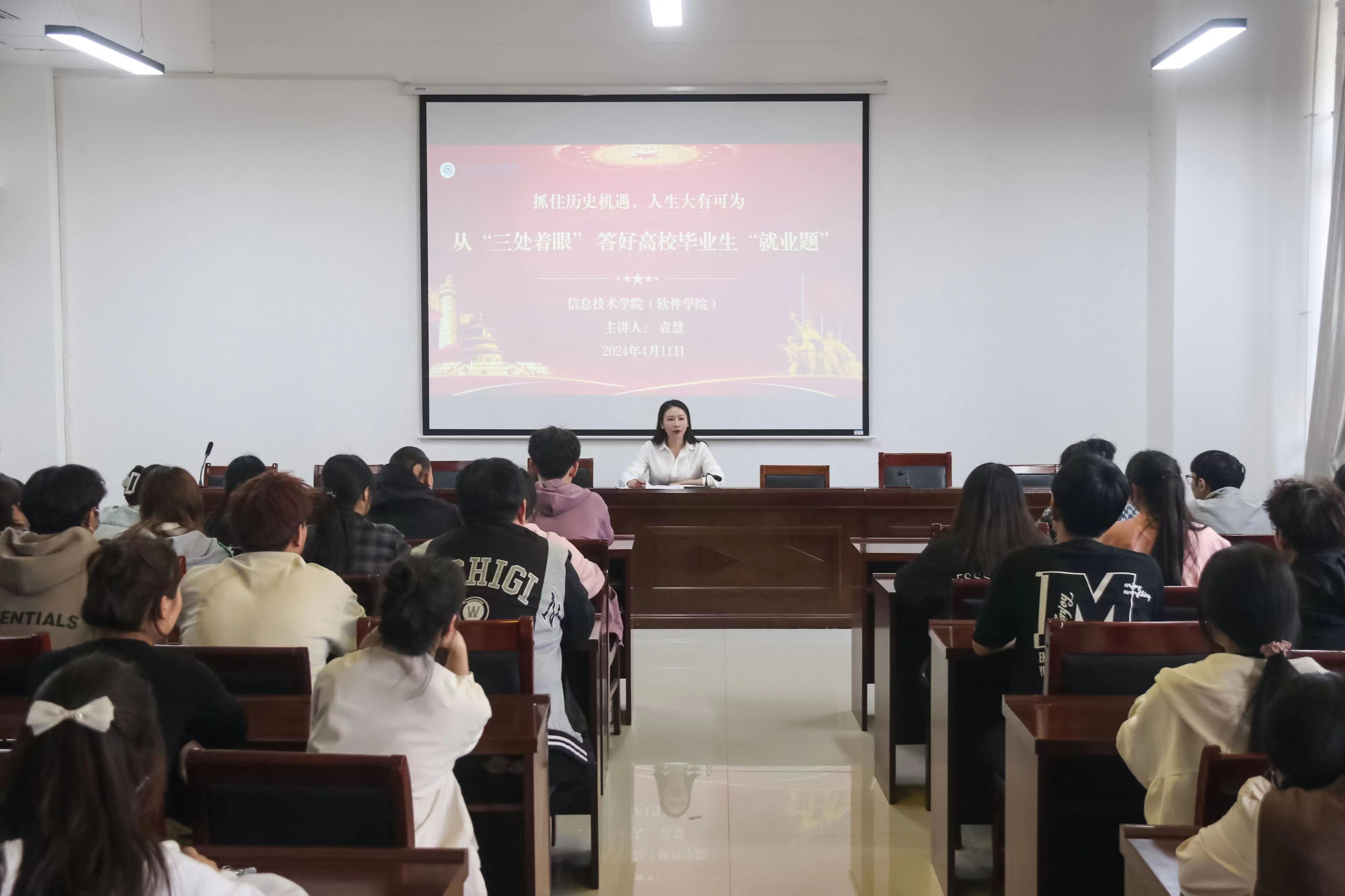 首先,袁慧结合党的二十大精神和2023年全国两会政府工作报告,她从“三处着眼”的角度出发,即从理念着眼、从问题着眼、从环境着眼,从经济形势、政策支持、就业压力以及未来发展等方面与同学们进行探讨,带领同学们全面了解当前的就业情况的形势与政策。