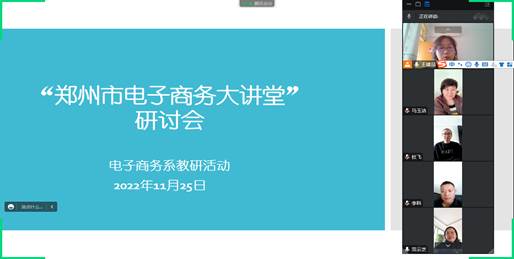 11月24日,电子商务系全体教师观看了“郑州电子商务大讲堂”讲座,11月25日下午两点半,电子商务系采用腾讯会议在线开展教研活动,主题为“郑州电子商务大讲堂”观后交流研讨,活动由系主任王建品主持。