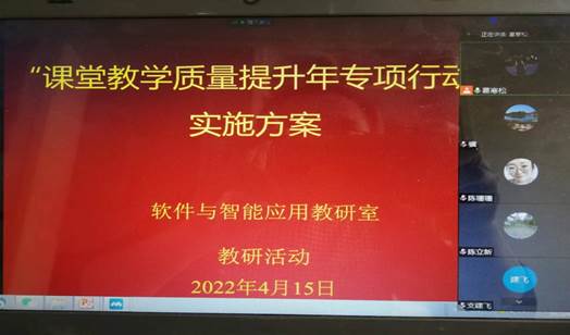 4月15日下午4:00,软件与智能应用教研室全体教师通过腾讯会议线上开展“课堂教学质量提升年专项行动”实施方案学习研讨活动,会议由教研室主任葛寒松主持。
