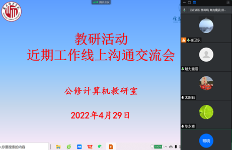 4月29日下午3点20分,公修计算机基础教研室借助腾讯会议开展教研活动,召开了近期工作线上沟通交流会,教研室主任崔卫东主持会议,教研室各位老师针对近期有关工作开展情况积极沟通发言,气氛活跃。