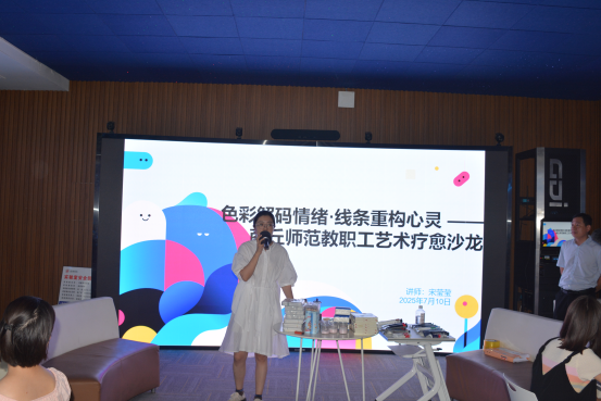 活动伊始,宋莹莹引导大家从最基础的元素入手,以简单的线条和形状勾勒出内心的图景,通过解析画作,阐释色彩心理学、构图象征等专业知识,引导教师们理解“画笔即心笔”的深层含义。