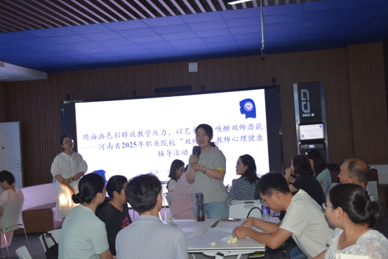 7月10日,世界杯体育官方网站开展“用油画色彩释放教学压力,以艺术表达唤醒双师潜能”绘画心理分析体验活动。活动由吴楚主持,特邀绘画心理学高级指导师宋莹莹担任主讲,42名教师参与活动。