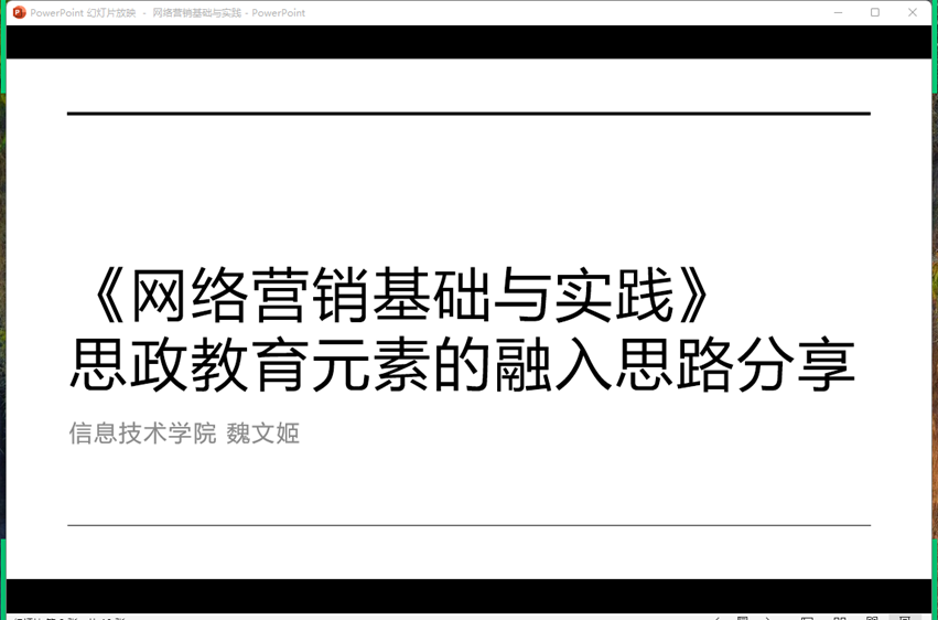 为进一步提升教师教学能力,加强教师沟通, 10月22日16点,电子商务系全体教师利用腾讯会议平台开展了题为融合思政、改革教学的课程思政教学设计研讨会。魏文姬老师以自己讲授的《网络营销基础与实践》为例,分享了讲课程思政元素融入的思路和经验。