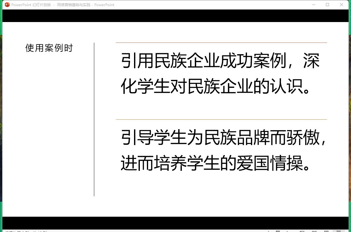 魏老师首先提出过去教学过程中由于选用国外教材总是使用大量国外企业的案例,在教学改革过程中首先更换了更适应需求的国内教材,同时更新了教学用的案例素材库。使用案例时,引用民族企业成功的案例,可以深化学生对民族企业的认识,同时引导学生为民族品牌而骄傲,进而可以培养学生的爱国情怀。